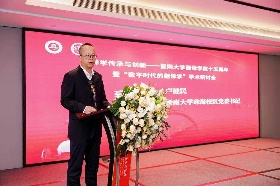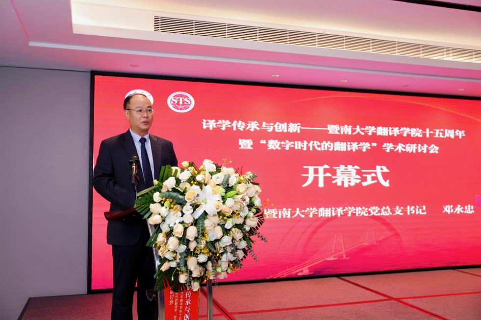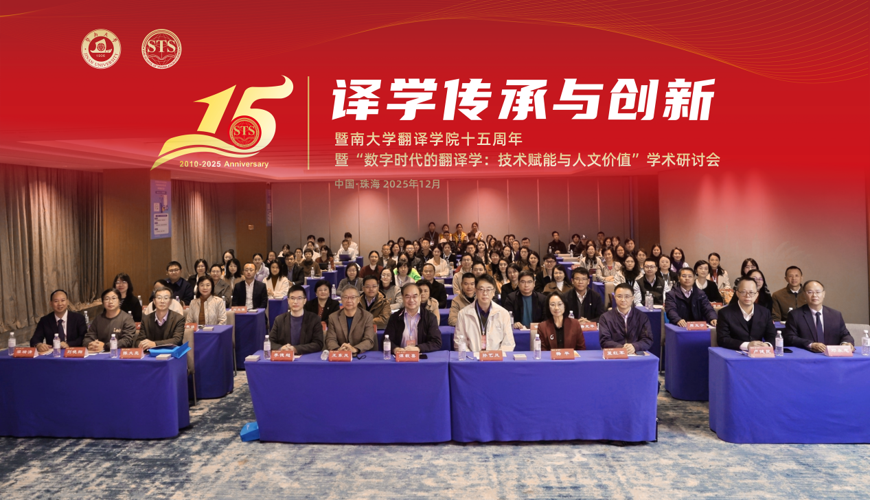 2025年12月27日,“译学传承与创新——暨南大学翻译学院建院十五周年暨‘数字时代的翻译学:技术赋能与人文价值’学术研讨会”在珠海暨南大学国际学术交流中心隆重举行。中国外文局中国翻译研究院副院长、《中国翻译》杂志主编杨平教授,广东省翻译协会会长、广东外语外贸大学/中山大学王东风教授,香港浸会大学谭载喜教授、澳门大学孙艺风教授、香港理工大学李德超教授、广东外语外贸大学蓝红军教授、苏州大学陈大亮教授等学界专家,暨南大学珠海校区党委书记卢健民以及在珠各职能部门和兄弟学院的领导,来自境内外30余所高校、行业协会、合作单位的专家学者,翻译学院的校友代表及学院师生共120余人齐聚一堂,共同见证了翻译学院成立十五年来筚路蓝缕的历史,并深入探讨了数字时代翻译学科的发展路径。大会开幕式由翻译学院党总支书记邓永忠主持。