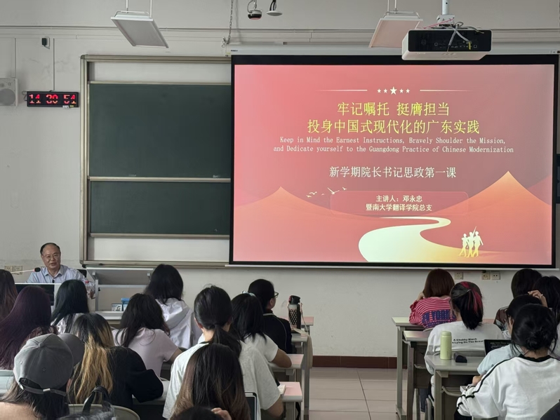 为深入学习贯彻习近平新时代中国特色社会主义思想,引导青年学子牢记嘱托、勇担使命,将个人成长融入国家发展与民族复兴大局,3月24日下午,翻译学院在珠海校区教学楼209课室开展新学期院长书记思政第一课。学院党总支邓永忠书记以“牢记嘱托 挺膺担当 投身中国式现代化的广东实践”为主题,结合翻译专业特色,以中英对照形式为学院70余名学生带来一堂思想深刻、双语融合、赋能专业成长的思政教育课。