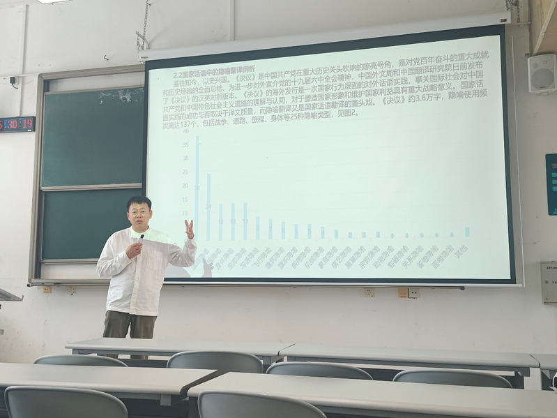 在核心内容分享中,孙教授系统阐释了国家翻译实践论的内涵、特征与理论框架,指出该理论是中国学者开创的具有国家性、民族性、主体性的本土学术创新成果,为国家话语翻译研究提供了全新视角。他强调,隐喻作为国家话语的重要表达形式,兼具强大认知功能与丰富联想意义,是国家话语翻译的重点与难点。通过解读《中共中央关于党的百年奋斗重大成就和历史经验的决定》中的汉英对照案例,孙教授详细分析了战争、道路、旅程、身体等10类高频隐喻的翻译策略,揭示了隐喻翻译背后传递国家意识形态、塑造国家形象的深层逻辑。